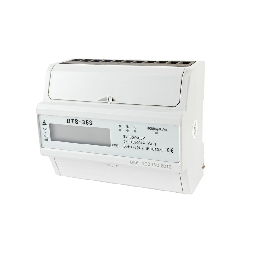 Třífázový elektroměr s LCD displejem pro střídavé napětí 3x230 V / 400 V, 50Hz, slouží k měření činné elektrické energie v přímém zapojení do obvodu. Je určen na podružné měření spotřeby samostatných spotřebičů nebo spotřebičů ve skupinách. Jedná se o přesný elektroměr, který měří již od minimálních hodnot protékajícího proudu (0,5 A) až po 100 A, velký LCD displej zobrazuje hodnoty na číselníku od 000000,1 až 999999,9 [kWh] a to bez přivedeného napájení po dobu až 10 let (záleží na okolním prostředí), zobrazené naměřené hodnoty nelze vymazat. Indikační LED blikají při odběru konkrétní fáze. Elektroměr má impulzní výstup na svorkách (9) S0+ a (8) S0-. To umožňuje připojení externího zařízení, které počítá impulzy (S0 dle normy DIN 43864) generované elektroměrem. Ke správné funkci elektroměru se nevyžaduje zapojení tohoto doplňkového zařízení. Montuje se na nosnou lištu 35 mm (DIN lištu), vestavná šířka je 122 mm (7 mod.). Šroubové svorky pro pohodlné připojení vodičů až do průřezu 35 mm2. Utahovací moment šroubů : svorka č. 1-7 = 3,0 - 4,0 Nm, svorka č. 8-9 = 1,5 - 2,5 Nm. Vlastní spotřeba je menší než 2 W.