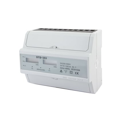 Třífázový elektroměr s dvoutarifním LCD displejem pro střídavé napětí 3x230 V / 400 V, 50Hz, slouží k měření činné elektrické energie v přímém zapojení do obvodu. Je určen na podružné měření spotřeby samostatných spotřebičů nebo spotřebičů ve skupinách. Jedná se o přesný elektroměr, který měří již od minimálních hodnot protékajícího proudu (0,5 A) až po 100 A. Dvoutarifní LCD displej zobrazuje hodnoty na číselníku od 00000,01 až 99999,99 [kWh] a to bez přivedeného napájení po dobu až 10 let (záleží na okolním prostředí), zobrazené naměřené hodnoty nelze vymazat. Pro změnu tarifu DEN / NOC připojte signál z HDO „nulový vodič“ na svorku č.11. Indikační LED blikají při odběru konkrétní fáze. Elektroměr má impulzní výstup na svorkách (9) S0+ a (8) S0-. To umožňuje připojení externího zařízení, které počítá impulzy (S0 dle normy DIN 43864) generované elektroměrem. Ke správné funkci elektroměru se nevyžaduje zapojení tohoto doplňkového zařízení. Montuje se na nosnou lištu 35 mm (DIN lištu), vestavná šířka je 122 mm (7 mod.). Šroubové svorky pro pohodlné připojení vodičů až do průřezu 35 mm2. Utahovací moment šroubů : svorka č. 1-7 = 3,0 - 4,0 Nm, svorka č. 8-11 = 1,5 - 2,5 Nm. Vlastní spotřeba je menší než 2 W.