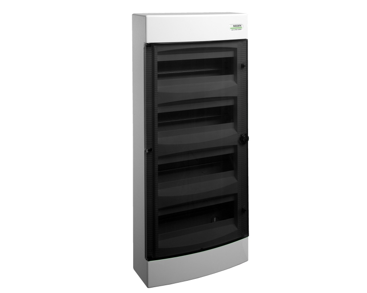 Noark nástěnná plastová rozvodnice 48 modulů /PNS 48T/ průhledné dveře, IP40, 4 řady (4x12M), N+PE svorkovnice 20+20 Plastové rozvodnice řady PNS pro montáž na omítku s krytím IP40 jsou určeny pro domovní a všeobecné aplikace. Rozvodnice PNS jsou určeny zejména pro domovní aplikace. Jejich design je vhodný pro povrchovou montáž. Balení obsahuje vlastní rozvodnici, dveře, přístrojové DIN lišty, N + PE svorkovnice, čelní kryt s výřezem pro přístroje, záslepku prázdných pozic a upevňovací materiál.