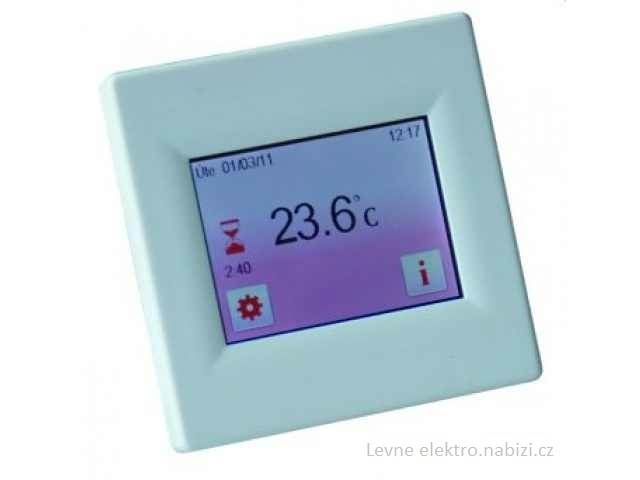 Digitální termostat s dotykovým displejem, možnost volby barevného pozadí, CZ menu. Provozní režimy „jen podlaha“, „jen prostor“, „podlaha+prostor“, možnost měření pomocí dvou externích (podlahových) sond, PWM regulace nebo pevná teplotní diference.